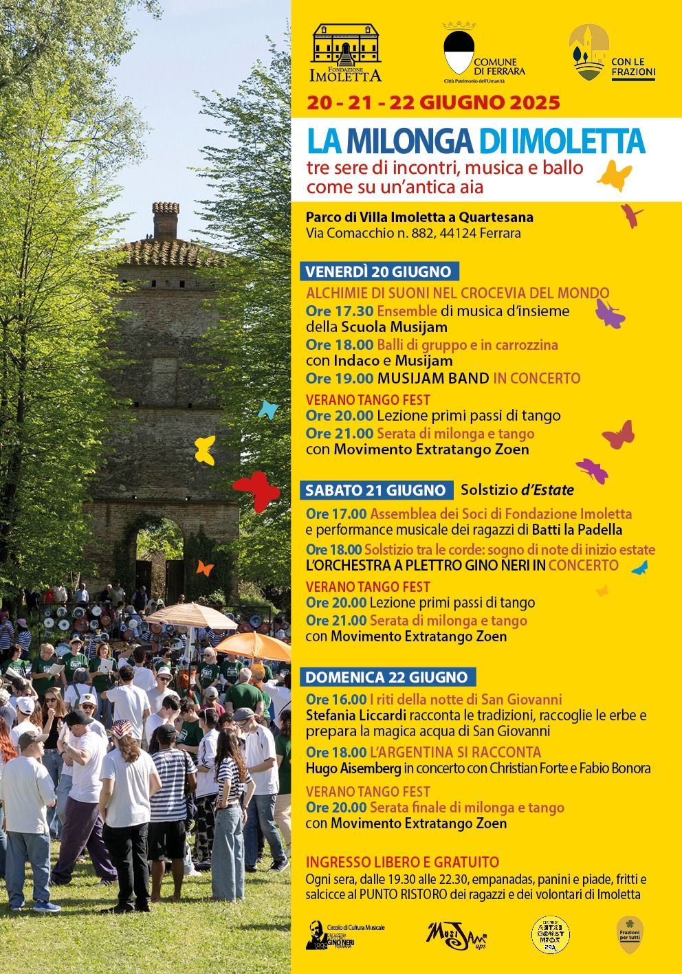 Venerdì 20 giugno la manifestazione sarà aperta nel pomeriggio dalla musica potente dell'orchestra ferrarese MusiJam che assieme ad IN.DA.CO. proporrà ai partecipanti balli in carrozzina, balli popolari e latinoamericani. Dalle 20.00 in avanti la pedana sarà poi tutta a disposizione di chi vorrà cimentarsi fino a notte fonda con il tango, con possibilità di usufruire di una iniziale lezione gratuita di Stefano e Francesca di Movimento Extratango Zoen.