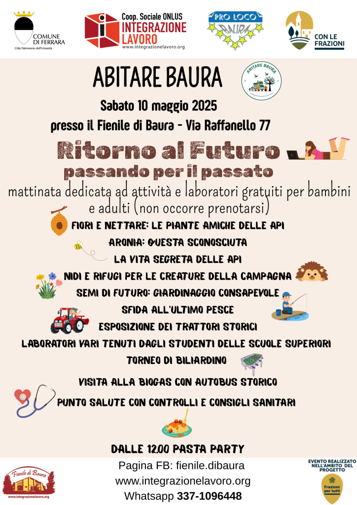 Dalle ore 10:00 - Laboratori nella corte colonica: Fiori e nettare con riconoscimento delle piante mellifere del Delta del Po a cura del Prof. Fabrizio Barbieri; La vita segreta delle api con didattica sulle api e sulla produzione del miele a cura dell'Associazione Apicoltori Estensi; Aronia, questa sconosciuta con proprietà e utilizzi della pianta a cura de Il Bosco Officinale; Nidi e rifugi con costruzione di habitat per la fauna selvatica a cura di La Quadra; Semi di futuro con laboratorio di giardinaggio consapevole a cura di La Quadra; Laboratori vari tenuti dagli studenti dell'ITI.